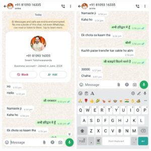 स्वामी के नाम पर एक फर्जी आईडी बना कर साइबर अपराधीयो ने मंगलवार देर शाम लोगो को अलग अलग नंबर से वाट्सअप मेसेज किए है। इन मेसेज मे लोगो से पैसो की मांग की गयी है। हरिद्वार मे कई लोगो को इन अपराधीयो द्वारा मेसेज किए गए। देर शाम तक यह मामला चर्चा मे बना रहा की आखिर पूर्व मंत्री को ऐसी क्या जरूरत पड़ गयी। वंही ज़ब मामला पूर्व कैबिनेट मंत्री के संज्ञान मे आया तो हलचल मच गयी।